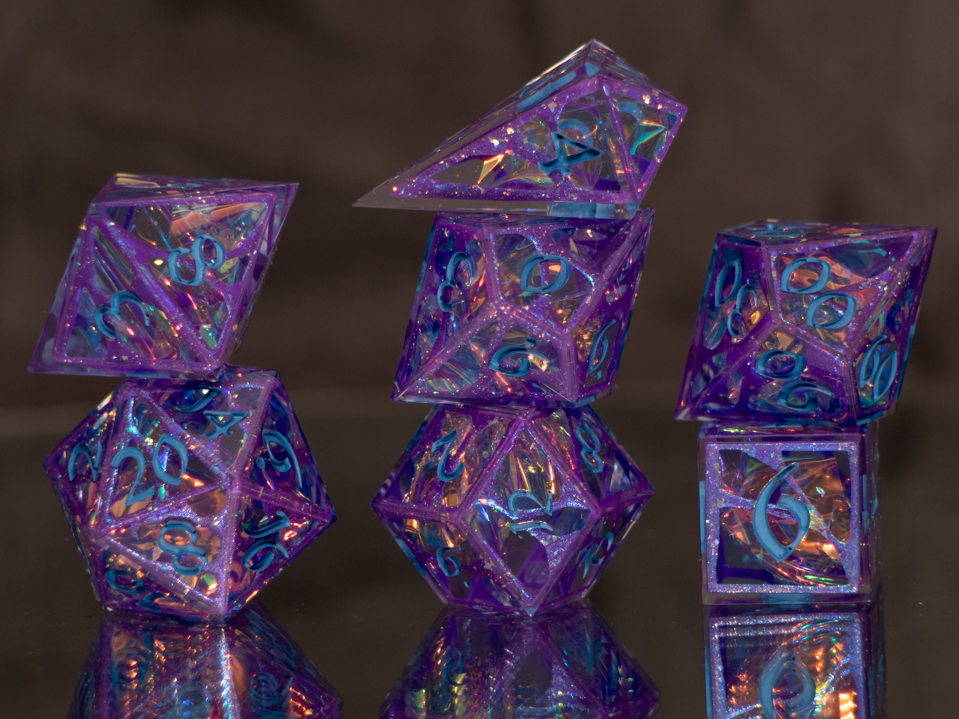 This set includes a shard D4, D8, D%, D10, D12, D6, and D20.