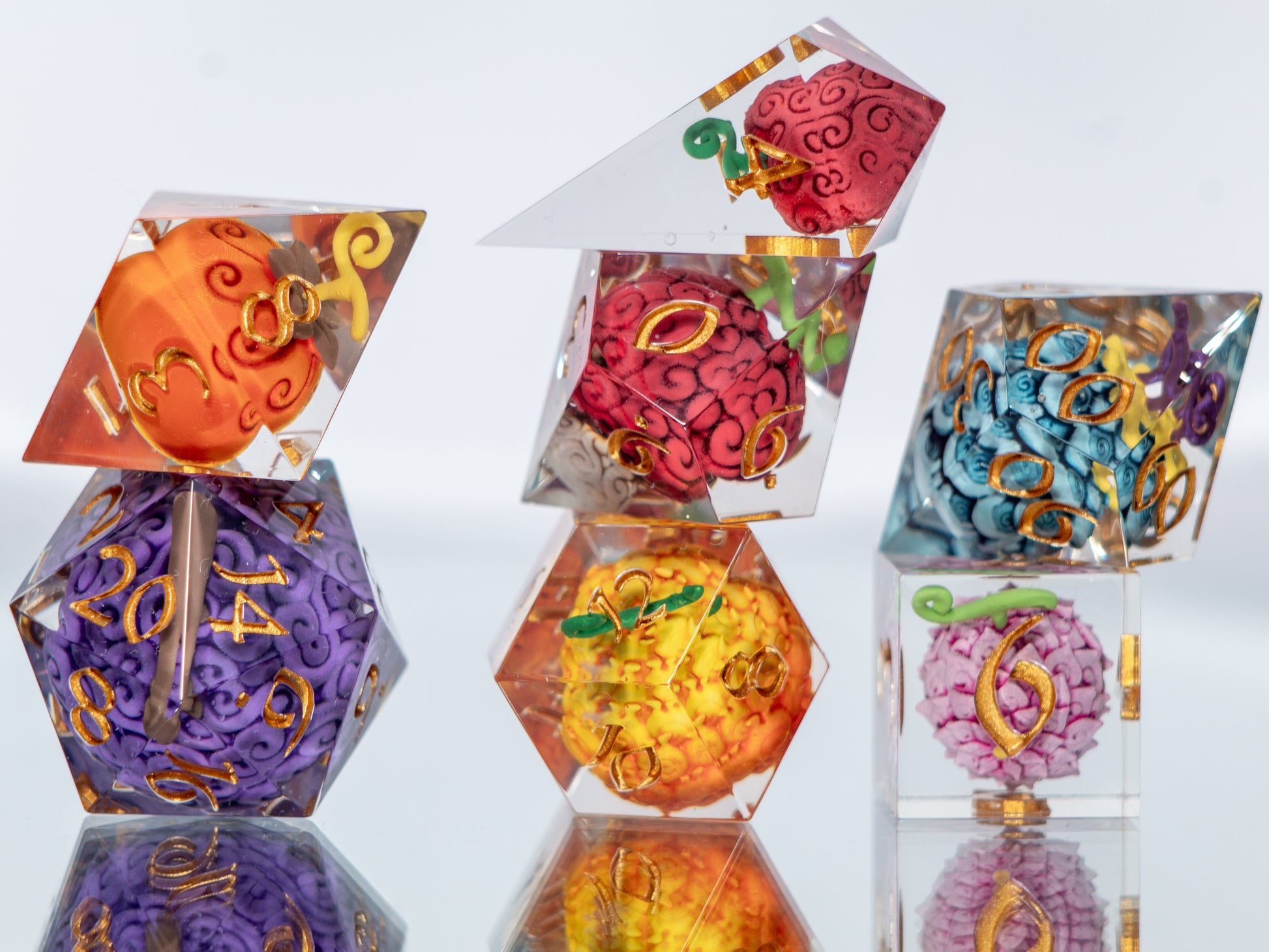 Devilish Fruits: Wano features individually hand painted fruits that were encased in clear resin. Each die features a different fruit. This set was finished with gold ink and includes a shard D4, D8, D6, D10, rhombic D12, D20, and D%. The fruit models were designed Adam Chai and Mave3Dprints.