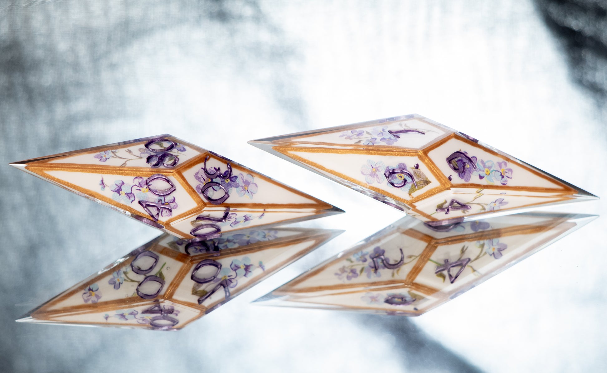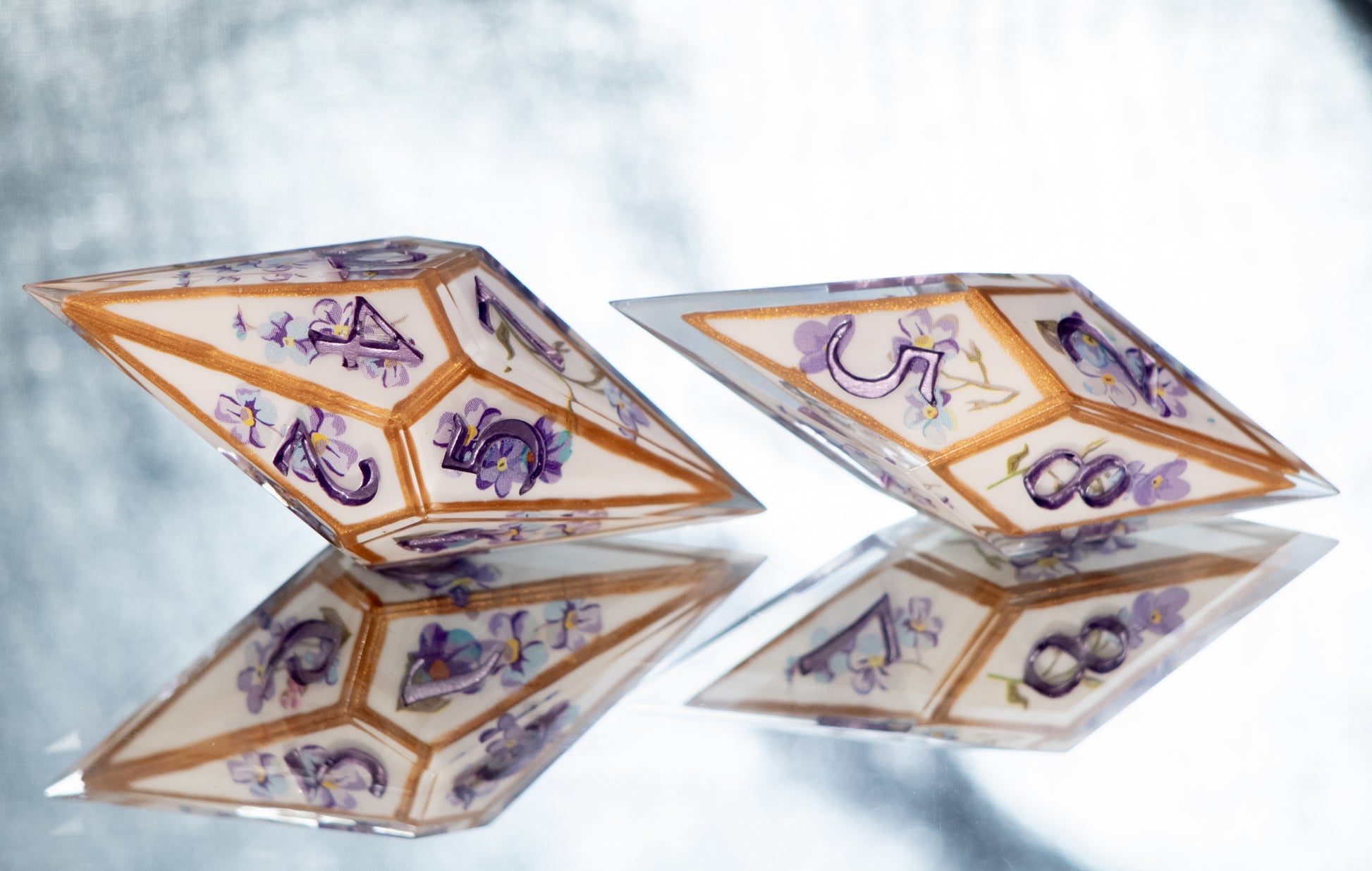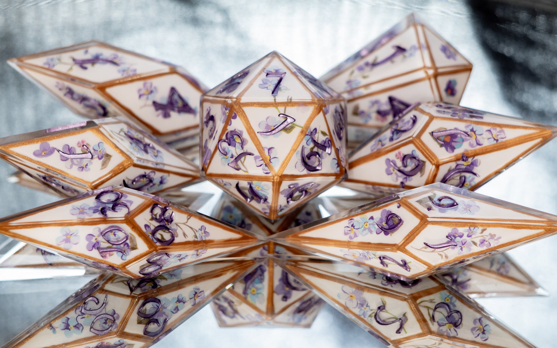 Forgotten Tea Time features white blank dice decorated with forget-me-not decals to make them look like porcelain tea cups. The blanks were carefully painted with slightly dark gold frames. It was then cast in clear resin to protect the design. They were finished with purple metallic ink. This set includes a shard D4, D8, D%, D10, D12, D6 and D20. These dice feature my alt shapes which are larger and more elongated than my normal sets.