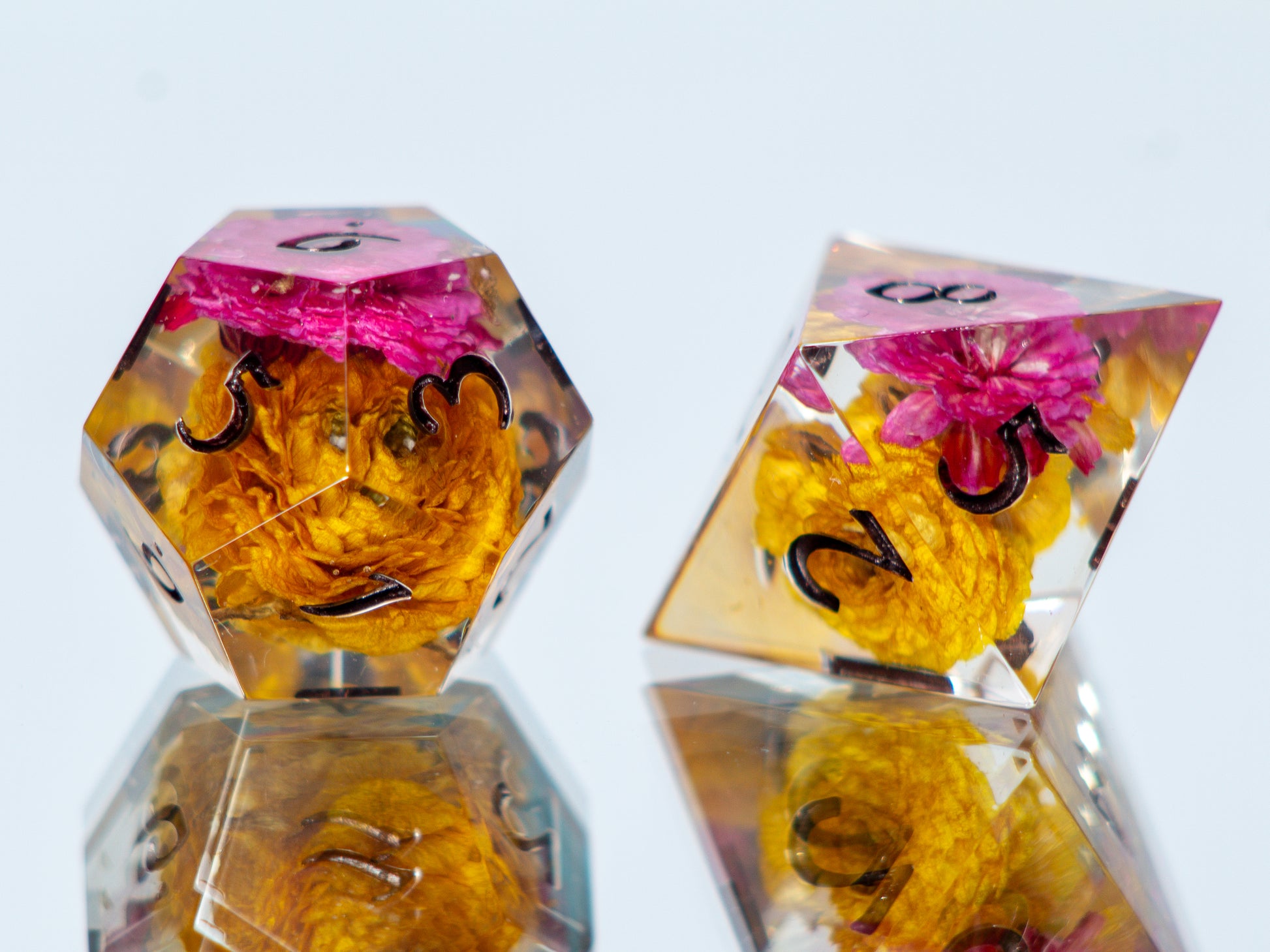 Jubilee features an arrangement of pink and yellow flowers finished with bronze colored ink. This set includes a crystal D4, D8, D6, D10, D12, D20, and D%.