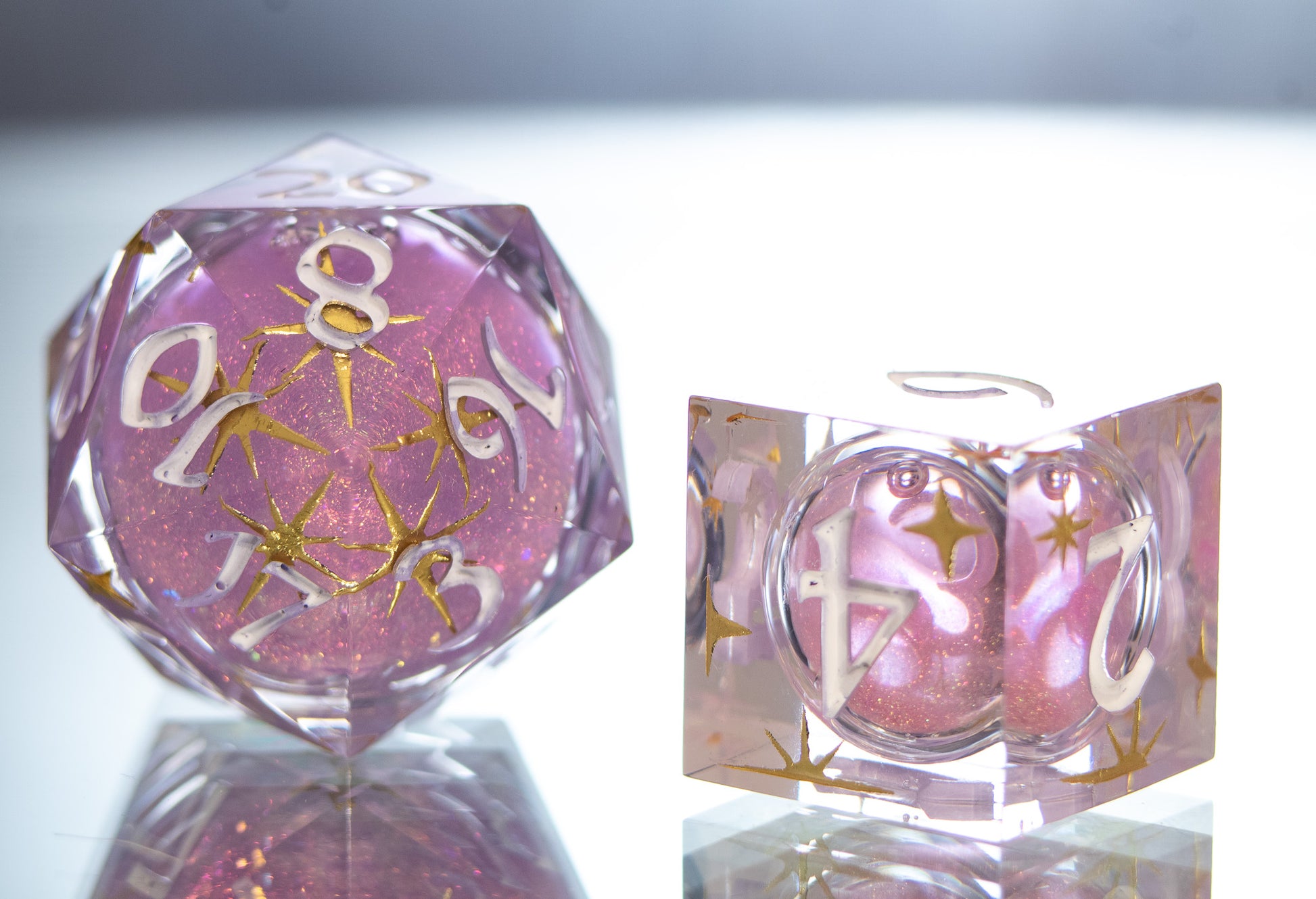 Princess Core features shimmery pink liquid cores in the center of clear resin blanks. Each blank is decorated with gold star decals. They were encased in clear resin and finished with white ink. This set includes a shard D4, D8, D6, D10, rhombic D12, D20, and D%.