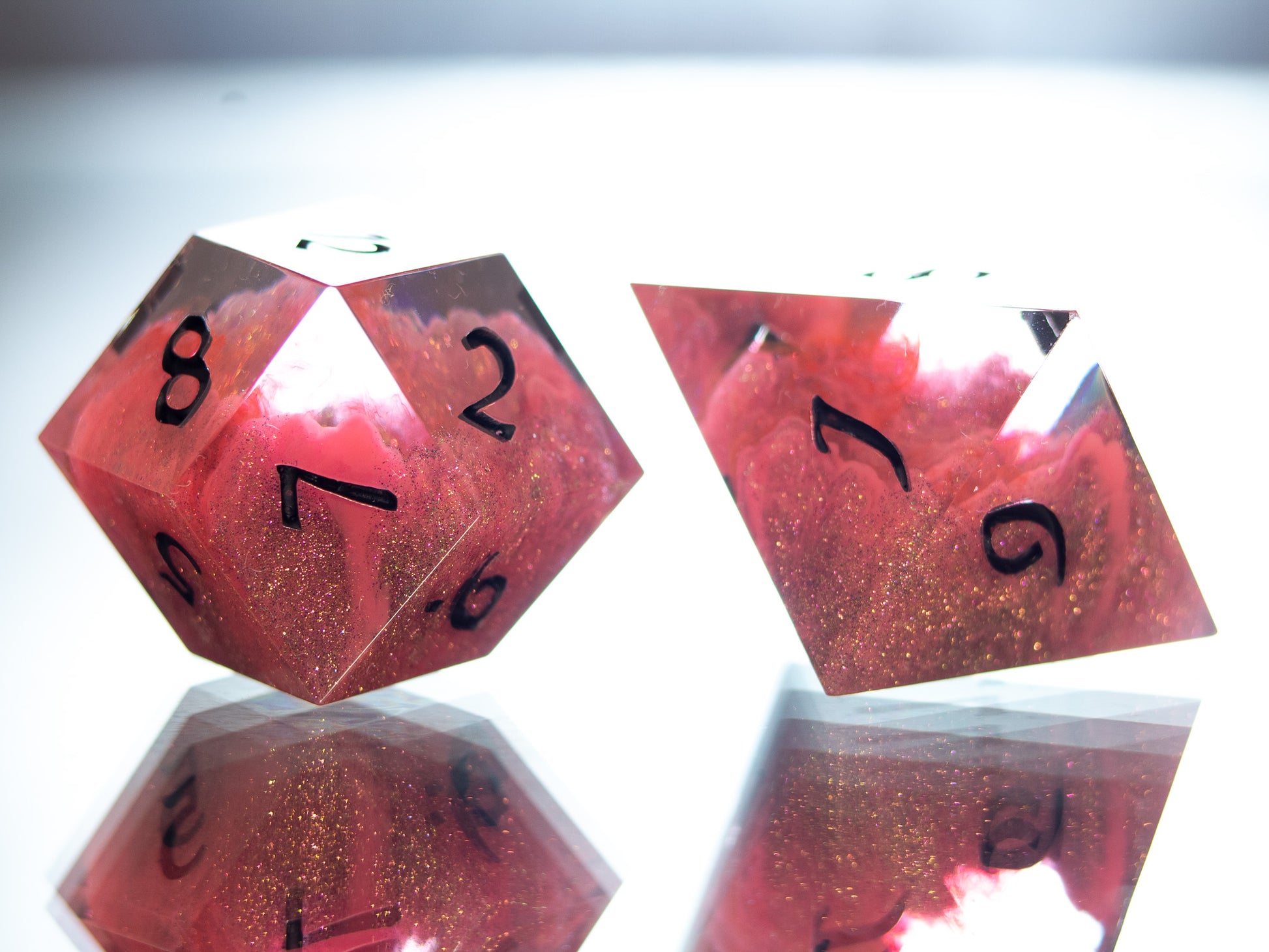 Due to the handmade nature of these dice, the surfaces on some dice may have small scratches, a more shallow number (usually the 1), a duller edge or mold marks, tiny pin sized holes, a stray bubble here or there, or slightly uneven painted numbers due to how the paint dried. Dice with inclusions may also have small raised surfaces where the inclusion has pushed against the surface, or inclusions that may have breached the surface. These makers marks are all cosmetic imperfections that do not effect how these dice roll.