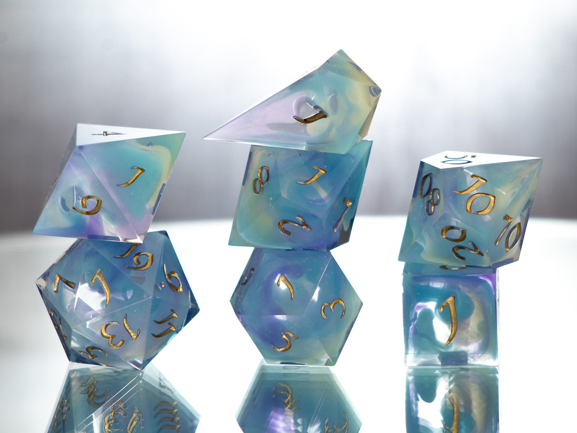 Watercolors features plumes of purple, blue, and yellow resin billowing against clear resin. They were finished with gold ink. This set includes a shard D4, D8, D6, D10, D12, D20, and D%.